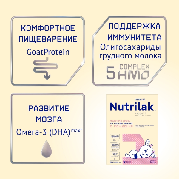 Nutrilak® 1 Premium PROGOAT* произведен на основе отборного козьего молока, способствует комфортному пищеварению и развитию иммунной системы, имеет сбалансированный состав для полноценного роста и интеллектуального развития малыша.