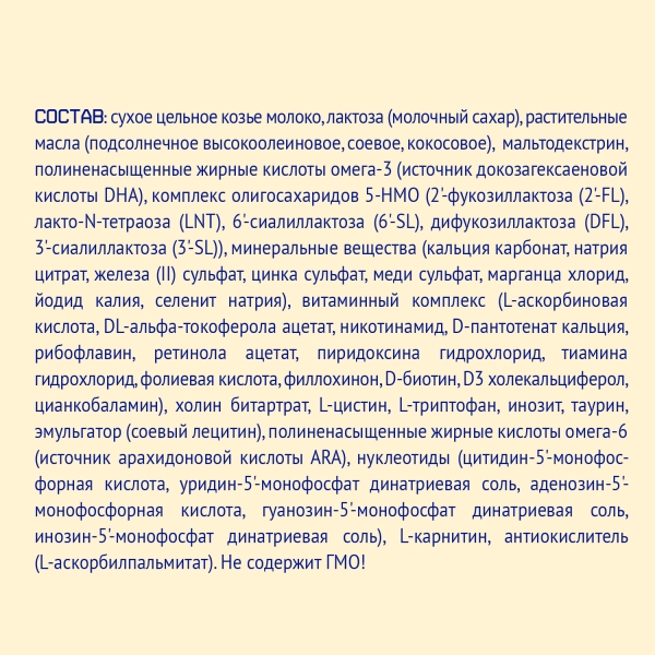 Cухое цельное козье молоко, лактоза (молочный сахар), растительные масла (подсолнечное высокоолеиновое, соевое, кокосовое), мальтодекстрин, полиненасыщенные жирные кислоты омега-3 (источник докозагексаеновой кислоты DHA), комплекс олигосахаридов 5-HMO (2'-фукозиллактоза (2'-FL), лакто-N-тетраоза (LNT), 6'-сиалиллактоза (6'-SL), дифукозиллактоза (DFL), 3'-сиалиллактоза (3'-SL)), минеральные вещества (кальция карбонат, натрия цитрат, железа (II) сульфат, цинка сульфат, меди сульфат, марганца хлорид, йодид калия, селенит натрия), витаминный комплекс (L-аскорбиновая кислота, DL-альфа-токоферола ацетат, никотинамид, D-пантотенат кальция, рибофлавин, ретинола ацетат, пиридоксина гидрохлорид, тиамина гидрохлорид, фолиевая кислота, филлохинон, D-биотин, D3 холекальциферол, цианкобаламин), холин битартрат, L-цистин, L-триптофан, инозит, таурин, эмульгатор (соевый лецитин), полиненасыщенные жирные кислоты омега-6 (источник арахидоновой кислоты ARA), нуклеотиды (цитидин-5'-монофосфорная кислота, уридин-5'-монофосфат динатриевая соль, аденозин-5'-монофосфорная кислота, гуанозин-5'-монофосфат динатриевая соль, инозин-5'-монофосфат динатриевая соль), L-карнитин, антиокислитель (L-аскорбилпальмитат). Не содержит ГМО!