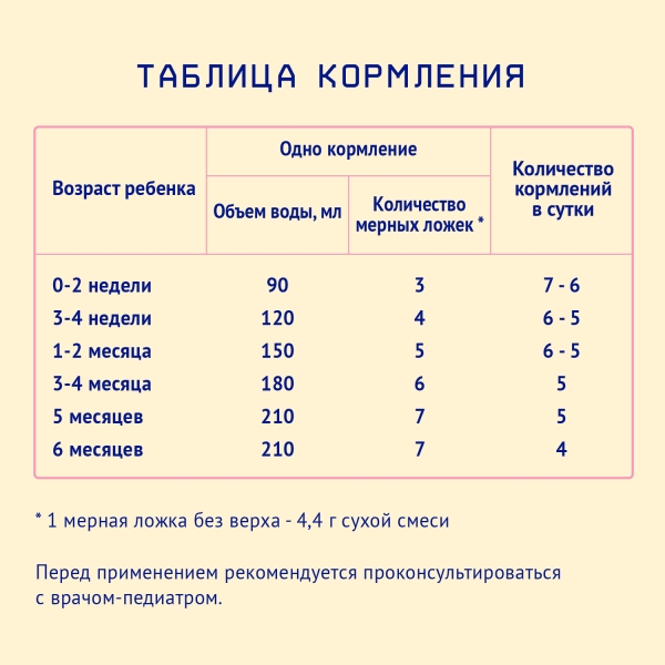 3-4 недели: на 1 кормление развести 3 мерных ложки смеси в 120 мл воды. В сутки – 6-5 кормлений.