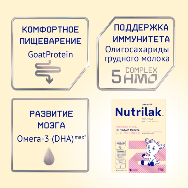 Смесь на основе козьего молока Nutrilak® 2 Premium предназначена для смешанного и искусственного вскармливания детей с 6 месяцев. Nutrilak® 2 Premium PROGOAT* произведен на основе отборного козьего молока, способствует комфортному пищеварению и развитию иммунной системы, имеет сбалансированный состав для полноценного роста и интеллектуального развития малыша.