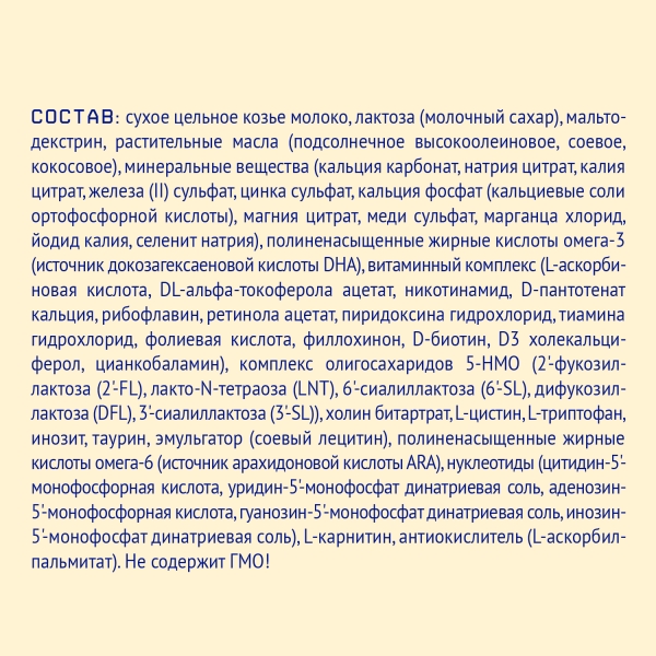 Сухое цельное козье молоко, лактоза (молочный сахар), мальтодекстрин, растительные масла (подсолнечное высокоолеиновое, соевое, кокосовое), минеральные вещества (кальция карбонат, натрия цитрат, калия цитрат, железа (II) сульфат, цинка сульфат, кальция фосфат (кальциевые соли ортофосфорной кислоты), магния цитрат, меди сульфат, марганца хлорид, йодид калия, селенит натрия), полиненасыщенные жирные кислоты омега-3 (источник докозагексаеновой кислоты DHA), витаминный комплекс (L-аскорбиновая кислота, DL-альфа-токоферола ацетат, никотинамид, D-пантотенат кальция, рибофлавин, ретинола ацетат, пиридоксина гидрохлорид, тиамина гидрохлорид, фолиевая кислота, филлохинон, D-биотин, D3 холекальциферол, цианкобаламин), комплекс олигосахаридов 5-HMO (2'-фукозиллактоза (2'-FL), лакто-N-тетраоза (LNT), 6'-сиалиллактоза (6'-SL), дифукозиллактоза (DFL), 3'-сиалиллактоза (3'-SL)), холин битартрат, L-цистин, L-триптофан, инозит, таурин, эмульгатор (соевый лецитин), полиненасыщенные жирные кислоты омега-6 (источник арахидоновой кислоты ARA), нуклеотиды (цитидин-5'-монофосфорная кислота, уридин-5'-монофосфат динатриевая соль, аденозин-5'-монофосфорная кислота, гуанозин-5'-монофосфат динатриевая соль, инозин-5'-монофосфат динатриевая соль), L-карнитин, антиокислитель (L-аскорбилпальмитат).