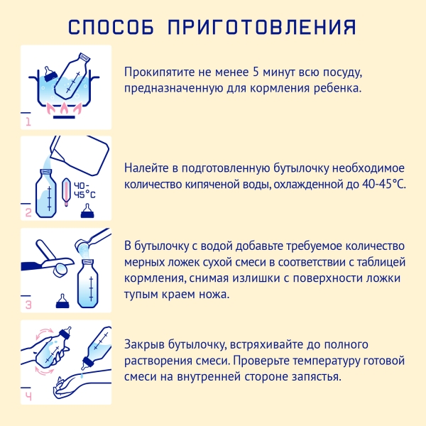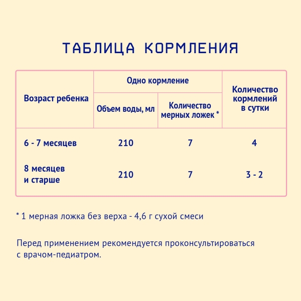 8 месяцев и старше: на 1 кормление развести 3 мерных ложки смеси в 210 мл воды. В сутки – 3-2 кормлений.