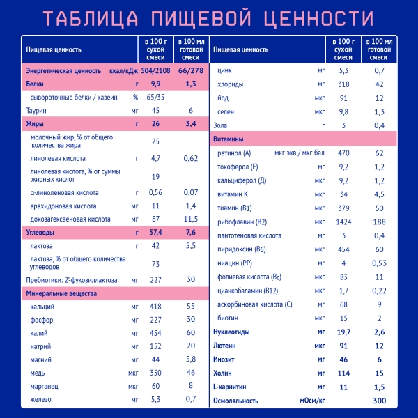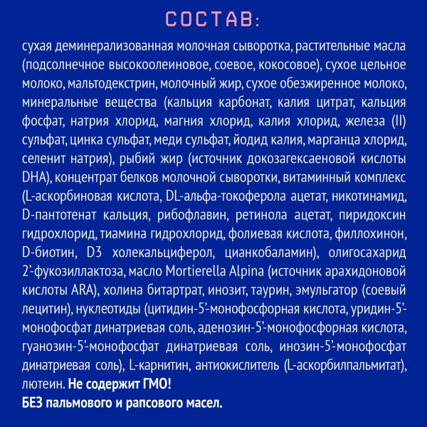 Сухая деминерализованная молочная сыворотка, растительные масла (подсолнечное высокоолеиновое, соевое, кокосовое), сухое цельное молоко, мальтодекстрин, молочный жир, сухое обезжиренное молоко, минеральные вещества (кальция карбонат, калия цитрат, кальция фосфат, натрия хлорид, магния хлорид, калия хлорид, железа (II) сульфат, цинка сульфат, меди сульфат, йодид калия, марганца хлорид, селенит натрия), рыбий жир (источник докозагексаеновой кислоты DHA), концентрат белков молочной сыворотки, витаминный комплекс (L-аскорбиновая кислота, DL-альфа-токоферола ацетат, никотинамид, D-пантотенат кальция, рибофлавин, ретинола ацетат, пиридоксин гидрохлорид, тиамина гидрохлорид, фолиевая кислота, филлохинон, D-биотин, D3 холекальциферол, цианкобаламин), олигосахарид 2’-фукозиллактоза, масло Mortierella Alpina (источник арахидоновой кислоты ARA), холина битартрат, инозит, таурин, эмульгатор (соевый лецитин), нуклеотиды (цитидин-5’-монофосфорная кислота, уридин-5’- монофосфат динатриевая соль, аденозин-5’-монофосфорная кислота, гуанозин-5’-монофосфат динатриевая соль, инозин-5’-монофосфат динатриевая соль), L-карнитин, антиокислитель (аскорбилпальмитат), лютеин.