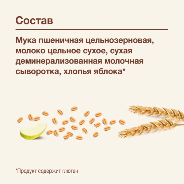 Мука пшеничная цельнозерновая, молоко цельное сухое, сухая деминерализованная молочная сыворотка, хлопья яблока. Содержит глютен.