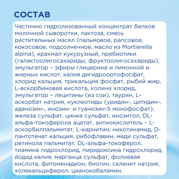 Частично гидролизованный концентрат белков молочной сыворотки, лактоза, смесь растительных масел (пальмовое, рапсовое, кокосовое, подсолнечное, масло из Mortierella alpina), крахмал кукурузный, пребиотики (галактоолигосахариды, фруктоолигосахариды), эмульгатор – эфиры глицерина и лимонной и жирных кислот, калия дигидроортофосфат, хлорид кальция, трикальция фосфат, рыбий жир, L-аскорбиновая кислота, холина хлорид, эмульгатор – лецитины (из сои), таурин, L-аскорбат натрия, нуклеотиды (уридин-, цитидин-, аденозин-, инозин- и гуанозин-5 монофосфат), железа сульфат, цинка сульфат, инозитол, DL-альфа-токоферола ацетат, антиокислитель – Lаскорбилпальмитат, L-карнитин, никотинамид, D-пантотенат кальция, рибофлавин, меди сульфат, ретинола пальмитат, DL-альфа-токоферол, тиамина гидрохлорид, пиридоксина гидрохлорид, йодид калия, марганца сульфат, фолиевая кислота, фитоменадион, биотин, селенит натрия, холекальциферол, цианокобаламин.