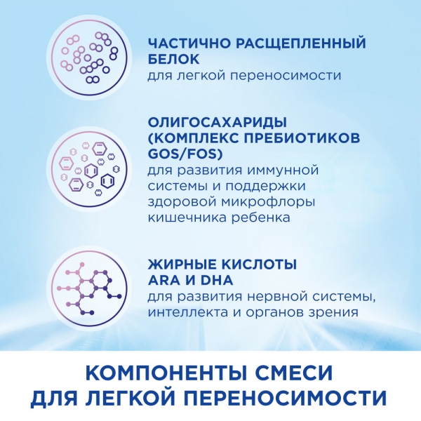 Иммуноактивные пребиотики GOS/FOS (олигосахариды), которые способствуют развитию иммунной системы ребенка, а также поддержке здоровой микрофлоры кишечника малыша;