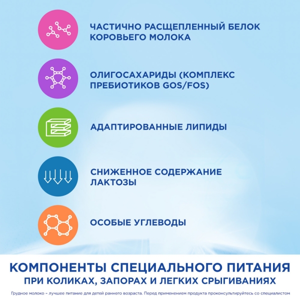 Nutrilon Комфорт 1 работает системно, обеспечивая 5 слагаемых комфорта: профилактику запоров, уменьшение колик, поддержку кишечной микрофлоры, легкое переваривание и уменьшение срыгиваний.