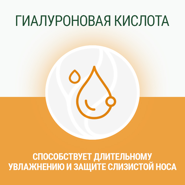 Гиалуроновая кислота является природным полимером, присутствует повсеместно в организме человека, обладает смазывающим, увлажняющим свойством и необходимой вязкостью, что способствует созданию защитной пленки в полости носа за счет своей высокой способности удерживать влагу, таким образом, обеспечивает равномерное длительное увлажнение слизистой носа и предохраняет слизистую оболочку от воздействия неблагоприятных факторов окружающей среды. Также в состав средства входит рацемический альфа-токоферола ацетат (Витамин Е), который за счет антиоксидантных свойств оказывает противовоспалительное действие.