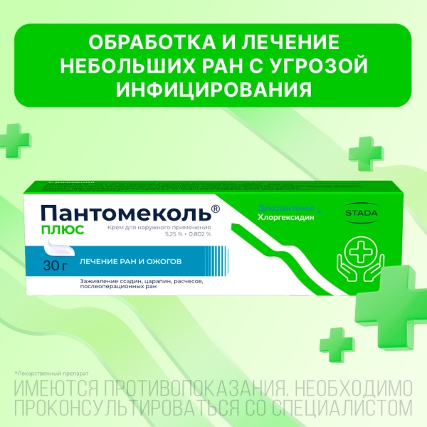 Крем Пантомеколь® Плюс защищает поверхность раны от инфекций, подавляет течение инфекционного процесса и ускоряет заживление.