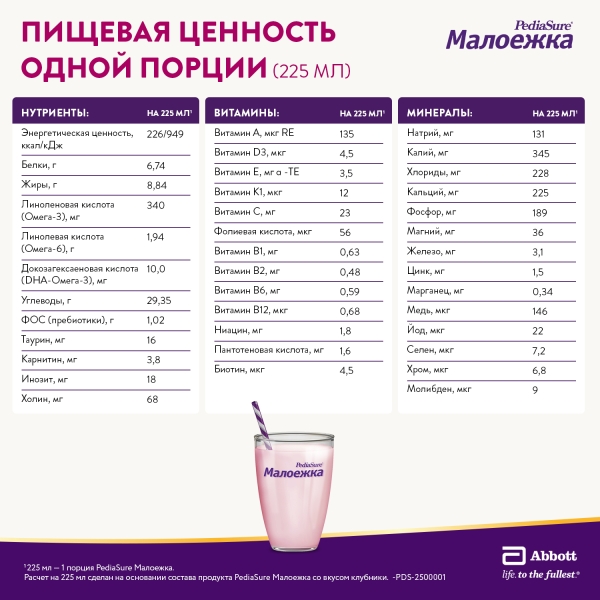 В отличие от популярных перекусов (таких как молоко детское, йогурт питьевой, молочный коктейль или пюре в паучах), Малоежка от ПедиаШур — это сбалансированное сочетание полноценного белка, жиров, углеводов, а также всех необходимых витаминов и минералов.