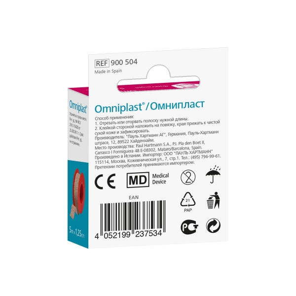 Пластырь ОМНИПЛАСТ предназначен для надежной фиксации повязок всех видов, для закрепления зондов, канюль, катетеров. Рекомендуется пациентам с чувствительной кожей. Гипоаллергенный фиксирующий пластырь из белого искусственного шёлка с синтетическим каучуковым клеем, воздухо- и паропроницаемый, надёжно держится, прочный, удаляется безболезненно и без остатков, благодаря зигзагообразной кромке легко отрывается поперёк, индифферентен к рентгеновским лучам, устойчив к температурным воздействиям. На пластмассовых катушках с защитным кольцом.