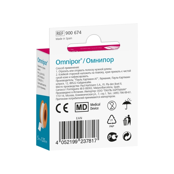 Пластырь ОМНИПОР предназначен для надежной фиксации повязок всех видов для закрепления зондов, канюль, катетеров. Рекомендуется пациентам с чувствительной кожей. Гипоаллергенный фиксирующий пластырь из белого искусственного шёлка с синтетическим каучуковым клеем, воздухо- и паропроницаемый надёжно держится, прочный, удаляется безболезненно и без остатков, благодаря зигзагообразной кромке легко отрывается поперёк, индифферентен к рентгеновским лучам, устойчив к температурным воздействиям. На пластмассовых катушках с защитным кольцом.