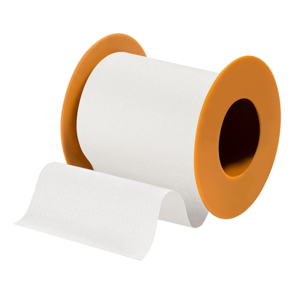 Гипоаллергенный фиксирующий пластырь из белого нетканого материала с синтетическим каучуковым клеем.