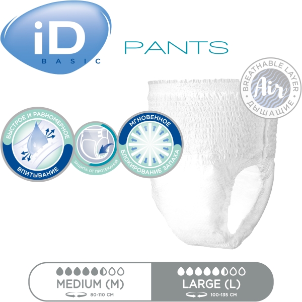 Подгузники-трусы iD PANTS BASIC напоминают обычное белье, они идеально прилегают к телу, незаметны под одеждой и не стесняют движений. Это прекрасное решение для использования при средней и тяжелой степени недержания для людей, ведущих активный образ жизни. Они обеспечивают моментальное впитывание и удержание влаги, благодаря чему кожа остается сухой, отличную защиту от протеканий и блокирование неприятных запахов. Мягкие, как хлопок, материалы дарят ощущение комфорта.