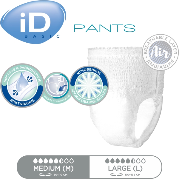 Подгузники-трусы iD PANTS BASIC напоминают обычное белье, они идеально прилегают к телу, незаметны под одеждой и не стесняют движений. Это прекрасное решение для использования при средней и тяжелой степени недержания для людей, ведущих активный образ жизни. Они обеспечивают моментальное впитывание и удержание влаги, благодаря чему кожа остается сухой, отличную защиту от протеканий и блокирование неприятных запахов. Мягкие, как хлопок, материалы дарят ощущение комфорта.