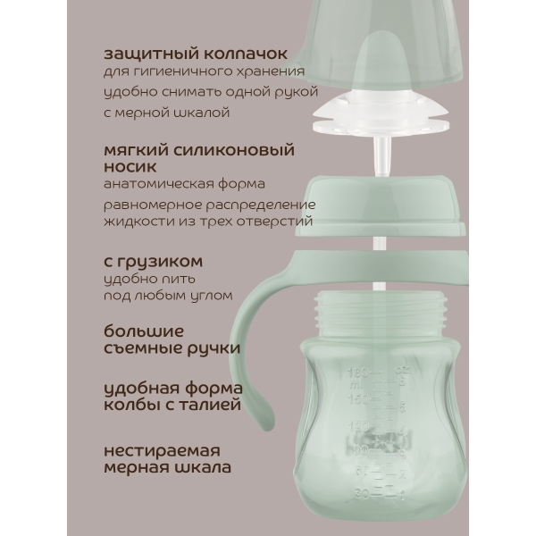 Поильник-непроливайка с мягким антиаллергенным силиконовым носиком идеально подойдет детям, которые учатся пить самостоятельно. Три отверстия в носике поильника равномерно распределяют поток жидкости и предотвращают захлебывание. Благодаря грузику пить из поильника можно под любым углом. Эргономичные съемные ручки позволят малышу самостоятельно держать поильник и пить без посторонней помощи. Легкий и небьющийся. Малый объем в 180 мл оптимален в использовании. Нестираемая мерная шкала на колбе обеспечивает контроль жидкости. Колпачок с мерной шкалой защищает носик от загрязнения и может использоваться как мерный стаканчик. Поильник изготовлен из безопасных качественных материалов. Подходит для разогревания напитков в микроволновой печи. Разрешается мытье в посудомоечной машине.