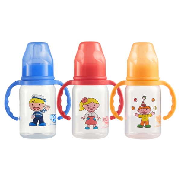 Бутылочка с ручками для кормления детей, находящихся на смешанном или искусственном вскармливании. Маленькая бутылочка с классическим горлышком и с силиконовой соской сконструирована максимально комфортно для мамы и малыша. В соске есть клапан спуска воздуха в следствие чего малыш не заглатывает воздух вместе с жидкостью, что снижает риск срыгивания после кормления. Легкая и небьющаяся бутылка удобна как для мам, так и подросших малышей. Без БФА.