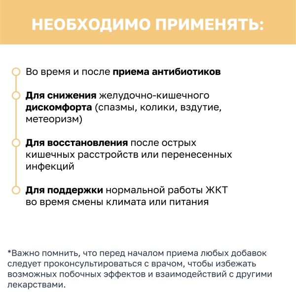 В качестве биологически активной добавки к пище - источника пробиотических микроорганизмов (бифидобактерий, лактобактерий), рекомендуется для поддержания в физиологических границах функций желудочно-кишечного тракта и микрофлоры кишечника.