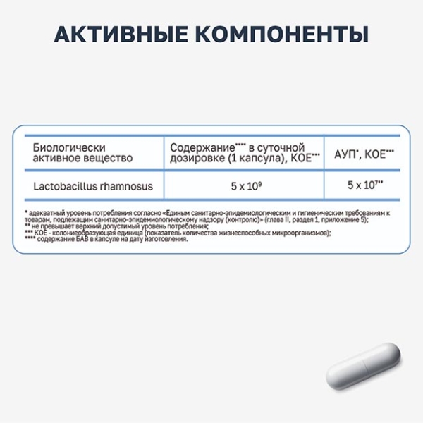 Микрокристаллическая целлюлоза (носитель), мальтодекстрин, оболочка капсулы (желатин), диоксид кремния (агент антислеживающий), Lactobacillus rhamnosus.