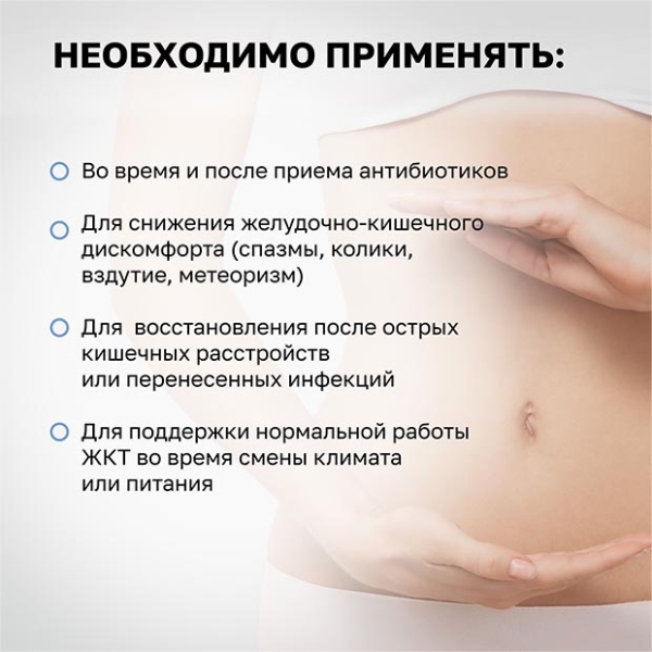 Входящие в состав компоненты способствуют поддержанию нормальной функции кишечника, восстановлению и нормализации микрофлоры кишечника, профилактике дисбактериоза, в том числе при неправильном и нерегулярном питании, при смене климата, во время и после антибактериальной терапии.