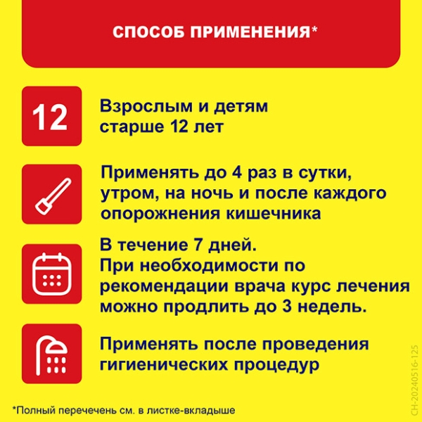 Мазь осторожно наносится через аппликатор на пораженные участки снаружи или внутри заднего прохода до 4 раз в день утром, вечером и после каждого опорожнения кишечника в течение 7-10 дней. После каждого применения тщательно промыть аппликатор и поместить его в защитный колпачок.