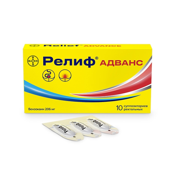 Препарат Релиф® Адванс – суппозитории ректальные, содержащие действующее вещество бензокаин. Препарат относится к фармакотерапевтической группе – ангиопротекторы; средства для лечения геморроя и анальных трещин для местного применения; местные анестетики.