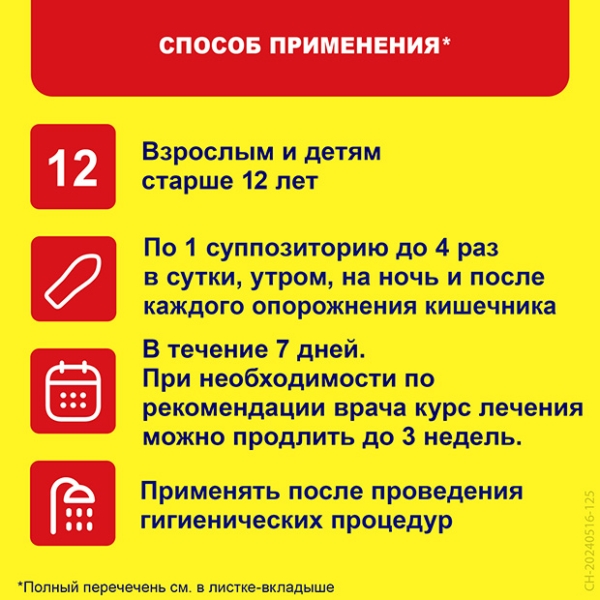 Рекомендуемая доза для взрослых: по 1 суппозиторию утром, на ночь и после каждого опорожнения кишечника до 4 раз в сутки в течение 7 дней.