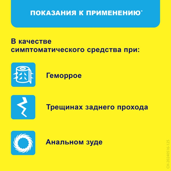 В качестве симптоматического средства при геморрое, трещинах заднего прохода, анальном зуде.
