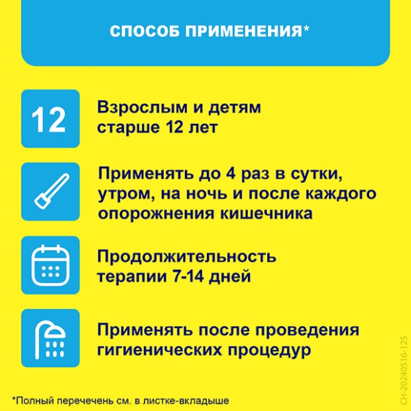 Мазь осторожно наносится через аппликатор на пораженные участки снаружи или внутри заднего прохода до 4 раз в день утром, вечером и после каждого опорожнения кишечника в течение 7-14 дней.