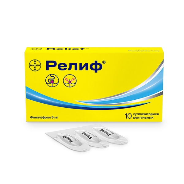 Препарат Релиф® – суппозитории ректальные, содержащие действующее вещество фенилэфрин. Препарат относится к фармакотерапевтической группе – средство лечения геморроя.