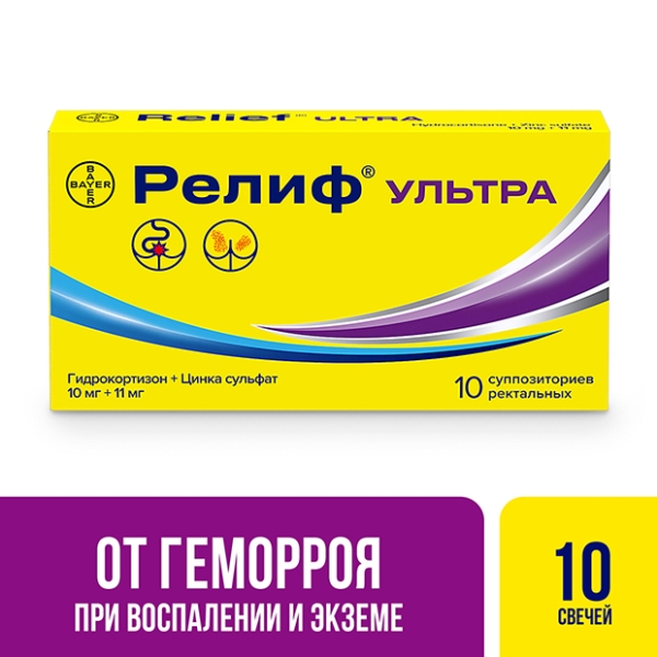 Препарат Релиф® Ультра – суппозитории ректальные, содержащие комбинацию действующих веществ: гидрокортизона ацетата и цинка сульфата моногидрата. Препарат относится к фармакотерапевтической группе – ангиопротекторы; средства для лечения геморроя и анальных трещин для местного применения; кортикостероиды (средство для лечения геморроя и анальных трещин, способствующее снижению повреждения сосудов за счет подавления воспалительных процессов).