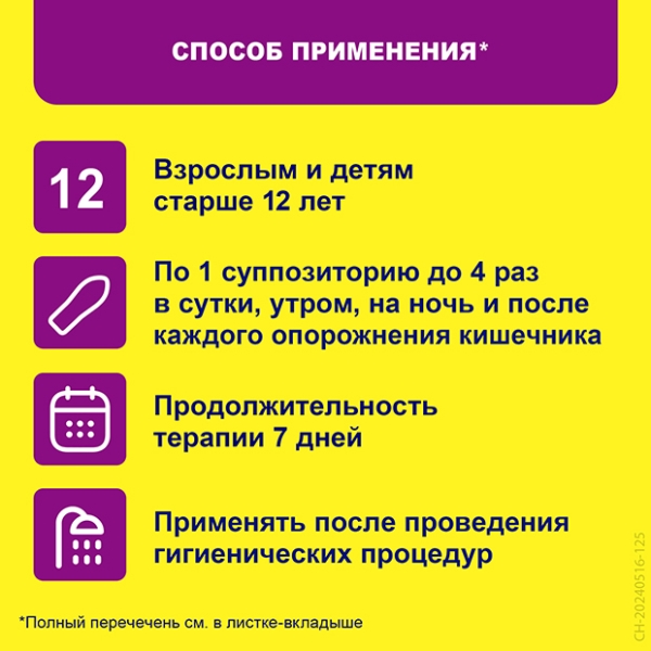 Рекомендуемая доза препарата Релиф® Ультра для взрослых: ректально по 1 суппозиторию утром, на ночь и после каждого опорожнения кишечника до 4 раз в сутки.