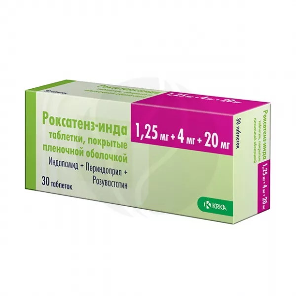 Роксатенз-инда – комбинированный препарат, содержащий периндоприл – ингибитор ангиотензинпревращающего фермента (АПФ), индапамид – тиазидоподобный диуретик и розувастатин – селективный, конкурентный ингибитор ГМГ-КоА-редуктазы (статин). Механизм действия препарата основан на фармакологических свойствах каждого из действующих веществ и аддитивного синергического действия периндоприла и индапамида.