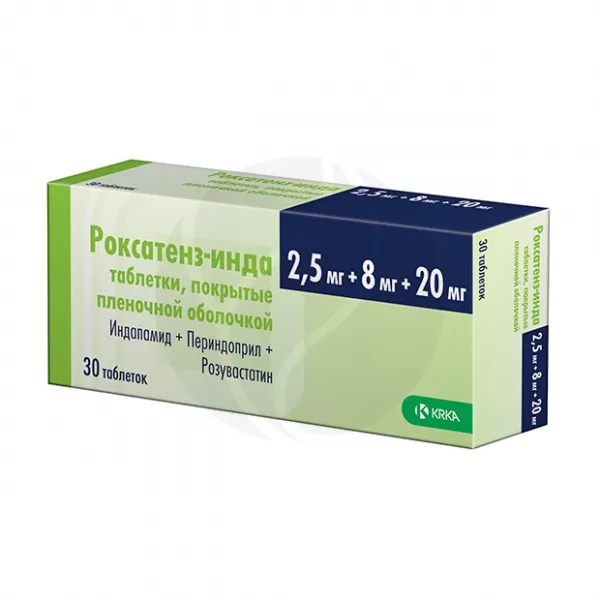 Роксатенз-инда – комбинированный препарат, содержащий периндоприл – ингибитор ангиотензинпревращающего фермента (АПФ), индапамид – тиазидоподобный диуретик и розувастатин – селективный, конкурентный ингибитор ГМГ-КоА-редуктазы (статин). Механизм действия препарата основан на фармакологических свойствах каждого из действующих веществ и аддитивного синергического действия периндоприла и индапамида.