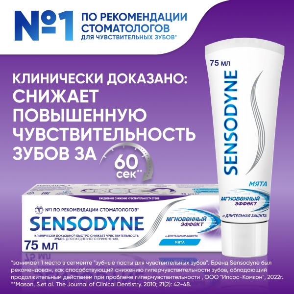 Зубная паста Sensodyne Мгновенный Эффект способствует снижению чувствительности зубов через 60 секунд после нанесения, обеспечивает мгновенное и продолжительное снижение боли при гиперчувствительности зубов, а также создает изолирующий слой на поверхности дентина и внутри дентинных канальцев. При чистке зубов 2 раза в день паста Sensodyne Мгновенный Эффект также защищает от кариеса благодаря содержанию фтора.