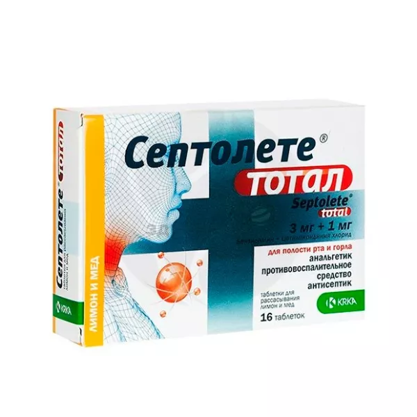 Препарат Септолете® тотал содержит действующие вещества бензидамин и цетилпиридиния хлорид. Относится к группе препаратов для лечения заболеваний горла. Бензидамин – нестероидное противовоспалительное средство, обладающее противовоспалительным, обезболивающим и местноанестезирующим действием. Цетилпиридиния хлорид – антисептик, оказывает противомикробное, противогрибковое, противовирусное действие.