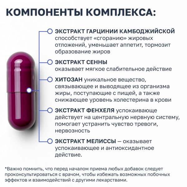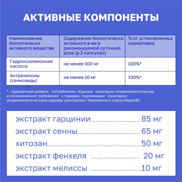 Желатин (оболочка капсулы), экстракт гарцинии, экстракт сенны, наполнитель лактоза, хитозан, экстракт фенхеля, экстракт мелиссы, антислеживающие агенты диоксид кремния аморфный (аэросил) и стеарат кальция, красители пищевые (оболочка капсулы): диоксид титана, индиготин, оксид железа желтый, оксид железа черный; или оксид железа красный, диоксид титана; или диоксид титана, индиготин; или кандурин серебряный сатиновый блеск; или диоксид титана.
