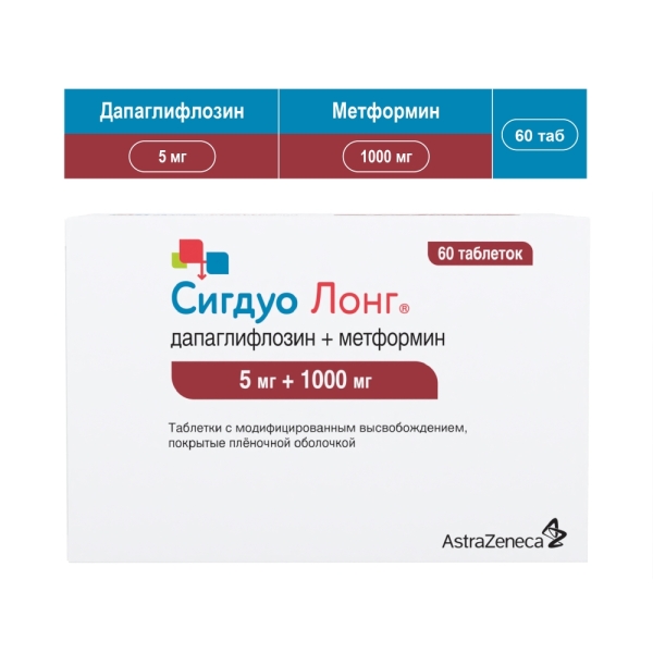 Сигдуо Лонг®, 5 мг + 1000 мг, таблетки с модифицированным высвобождением, покрытые пленочной оболочкой
