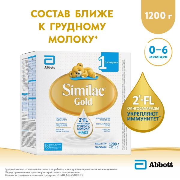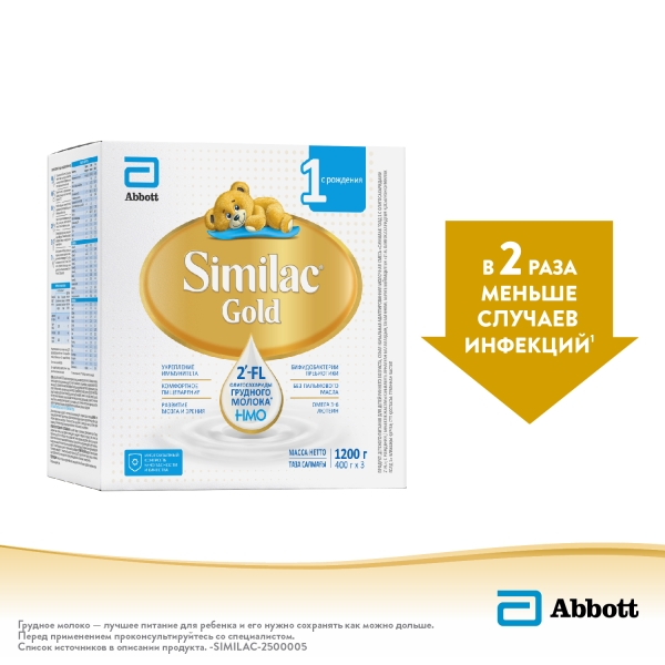 Similac Gold – детская молочная смесь с уникальным составом2 : 2'-FL олигосахариды грудного молока способствуют укреплению иммунитета* и снижению риска случаев инфекций в 2 раза1, комплекс пре- и пробиотиков обеспечивает здоровье микрофлоры и комфортное пищеварение.