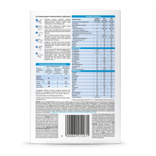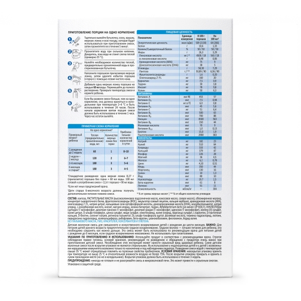 Лактоза, РАСТИТЕЛЬНЫЕ МАСЛА, (высокоолеиновое подсолнечное масло, кокосовое масло, соевое масло), обезжиренное молоко, концентрат сывороточного белка, фруктоолигосахариды (ФОС), эмульгатор соевый лецитин, кальция карбонат, арахидоновая кислота (ARA), олигосахарид 2'-FL, натрия цитрат, кальциевые соли ортофосфорной кислоты, докозагексаеновая кислота (DHA), аскорбилпальмитат, натрия хлорид, L-аскорбиновая кислота, инозит, магния хлорид, холина битартрат, таурин, Bifidobacterium lactis (не менее 106 КОЕ/г), НУКЛЕОТИДЫ (цитидин 5'-монофосфат, динатрия гуанозин 5'-монофосфат, динатрия уридин 5'-монофосфат, аденозин 5'-монофосфат), железа (II) сульфат, калия цитрат, D-альфа-токоферол, цинка сульфат, меди сульфат, никотинамид, калия хлорид, марганца сульфат, L-карнитин, D-пантотенат кальция, D-биотин, селенит натрия, ретинола пальмитат, DL-альфа-токоферола ацетат, фолиевая кислота, тиамина гидрохлорид, лютеин, пиридоксина гидрохлорид, холекальциферол, рибофлавин, бета-каротин, цианокобаламин, филлохинон, йодид калия.