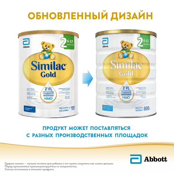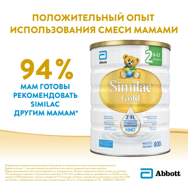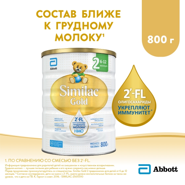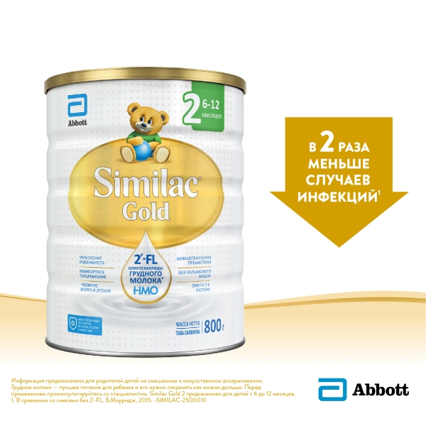 Similac Gold – детская молочная смесь с уникальным составом2: 2'-FL олигосахариды грудного молока способствуют укреплению иммунитета* и снижению риска случаев инфекций в 2 раза1, комплекс пре- и пробиотиков обеспечивает здоровье микрофлоры и комфортное пищеварение.