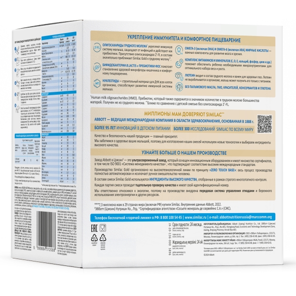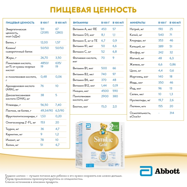 Similac Gold – детская молочная смесь с уникальным составом2: 2'-FL олигосахариды грудного молока способствуют укреплению иммунитета* и снижению риска случаев инфекций в 2 раза1, комплекс пре- и пробиотиков обеспечивает здоровье микрофлоры и комфортное пищеварение.