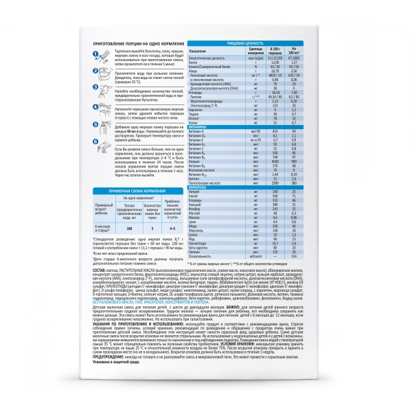 Лактоза, РАСТИТЕЛЬНЫЕ МАСЛА (высокоолеиновое подсолнечное масло, соевое масло, кокосовое масло), обезжиренное молоко, концентрат сывороточного белка, фруктоолигосахариды (ФОС), эмульгатор соевый лецитин, натрия цитрат, кальция карбонат, арахидоновая кислота (ARA), олигосахарид 2'-FL, магния хлорид, кальциевые соли ортофосфорной кислоты, докозагексаеновая кислота (DHA), аскорбилпальмитат, инозит, L-аскорбиновая кислота, холина битартрат, таурин, Bifidobacterium lactis (не менее 106 КОЕ/г), железа (II) сульфат, НУКЛЕОТИДЫ (цитидин 5'-монофосфат, динатрия гуанозин 5'-монофосфат, динатрия уридин 5'-монофосфат, аденозин 5'-монофосфат), D-альфа-токоферол, цинка сульфат, меди сульфат, никотинамид, калия цитрат, калия хлорид, L-карнитин, марганца сульфат, D-пантотенат кальция, D-биотин, селенит натрия, DL-альфа-токоферола ацетат, ретинола пальмитат, фолиевая кислота, лютеин, тиамина гидрохлорид, пиридоксина гидрохлорид, холекальциферол, бета-каротин, рибофлавин, цианокобаламин, филлохинон, йодид калия.