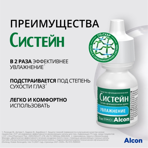Средство офтальмологическое Систейн – это стерильный раствор, содержащий полиэтиленгликоль 400, пропиленгликоль, гидроксипропилгуар, кислоту борную, кальция хлорид, магния хлорид, калия хлорид, натрия хлорид, цинка хлорид, консервант ПОЛИКВАД (поликватерниум-1) 0,001%, воду очищенную.