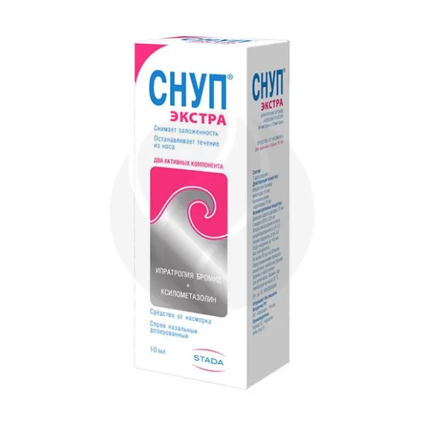 Одно вспрыскивание препарата Снуп® Экстра содержит около 70 мкг ксилометазолина гидрохлорида и 84 мкг ипратропия бромида.