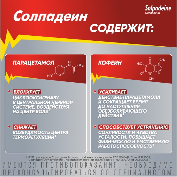 Препарат Солпадеин Актив оказывает обезболивающее и жаропонижающее действие. Препарат содержит комбинацию двух активных ингредиентов: парацетамола и кофеина.