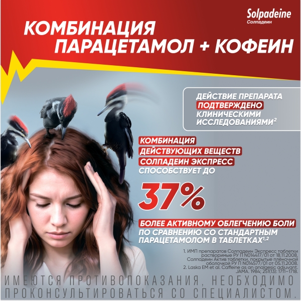 Препарат Солпадеин Актив не следует применять с другими парацетамолсодержащими препаратами, поскольку совместный прием препаратов может вызвать передозировку парацетамола.