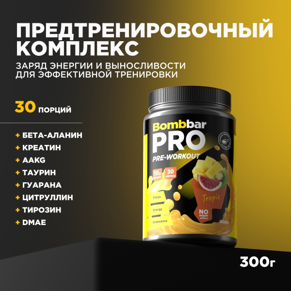 ✓ Цена на Bombbar Pro Pre-Workout предтренировочный коктейль вкус тропик, 300г указана на сайте и в мобильном приложении