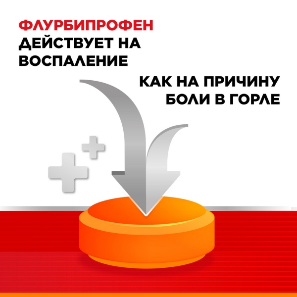 Таблетка полностью растворяется в полости рта в течение 5-12 минут. Абсорбция – высокая, флурбипрофен быстро и практически полностью всасывается, распределяется по всему организму и в значительной степени связывается с белками плазмы. Флурбипрофен обнаруживается в крови через 5 мин, максимальная концентрация флурбипрофена в плазме крови (Сmax) достигается через 40–45 минут после рассасывания.