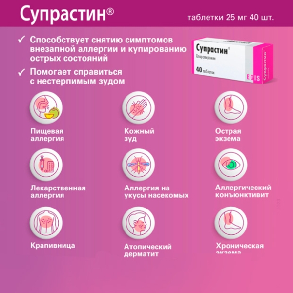✓ Купить Супрастин таблетки 25мг, №40 можно на сайте, в мобильном приложении и в аптеках Вита